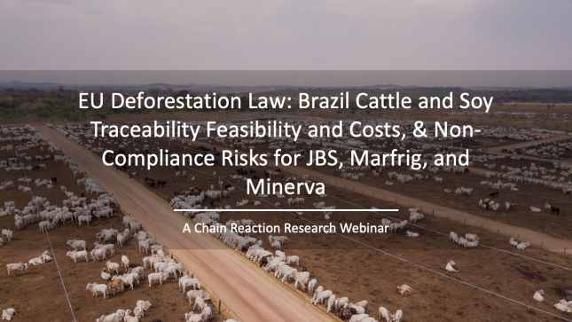 Chain Reaction Research held a webinar that covers the findings of two reports assessing the EU Deforestation Law and its impacts on stakeholders within Brazilian cattle and soy supply chains.