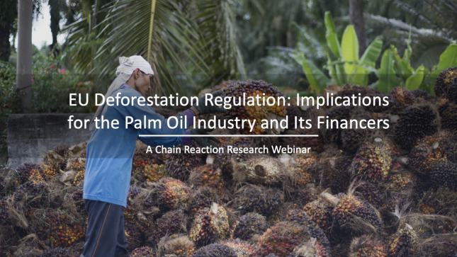 Chain Reaction Research on July 11 held a webinar to discuss the European Commission’s new regulation on deforestation-free products and how its requirements will affect the palm oil industry. The upcoming law, expected for implementation in 2023, will have implications for the palm oil supply chain actors and its financers. We will discuss our recently published report on the regulation identifying the potential costs of compliance and financial risks of non-compliance. Watch this webinar to learn more about the regulation’s relevant implications for the palm oil industry around traceability, smallholder exclusion, leakage, and the December 2020 cut-off date.