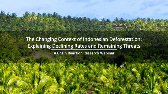 Chain Reaction Research held a webinar on April 14th to share our research on deforestation in Indonesia that is attributed to the development of oil palm plantations. Palm oil-driven deforestation has fallen to its lowest level in four years in 2021.