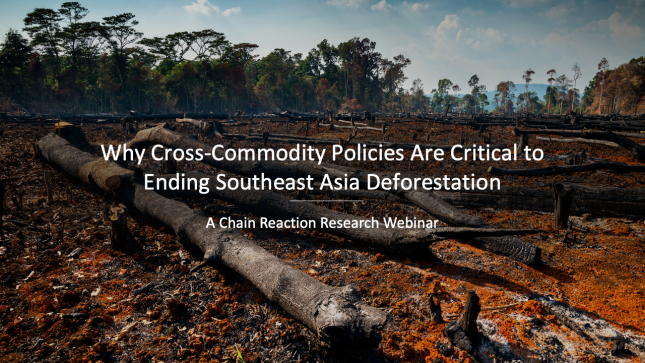 To continue reducing deforestation in Southeast Asia, new approaches are needed. CRR held a webinar to discuss our report that focused on one potential solution: cross-commodity deforestation policies. Applying zero-deforestation policies, which have been successful in the palm oil sector, across company structures and activities to other commodities could be a relatively low-cost and effective measure to address deforestation and prevent financial risks for buyers and investors.