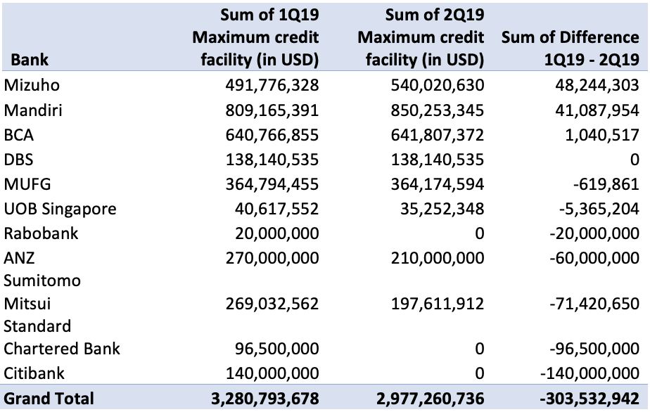 Indofood Sukses Makmur’s (Indofood) financial statements for 1H19 show that Citigroup, Standard Chartered and Rabobank no longer offer credit facilities to the company. Both Rabobank and Citigroup have reportedly cut ties with Indofood because of sustainability concerns at its subsidiary Indofood Agri Resources (IndoAgri) and related entities. Combined, the three banks provided credit facilities of USD 118 million. This amount represents approximately 3 percent of all credit facilities available to Indofood in the first quarter of 2019.