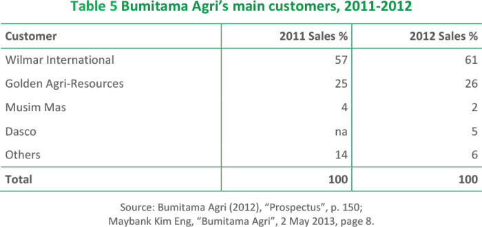 Table 5 shows that Bumitama Agri’s sales were largely dependent on two major customers, Wilmar International and Golden Agri-Resources, in 2011 and 2012.