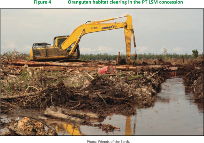 In its 2012 annual report, published in March 2013, Bumitama Agri stated that its policy was to “refrain from putting at risk areas of High Conservation Value (HCV) interest or habitats important for endangered plant or animal species.”22 However, International Animal Rescue filed a complaint with the RSPO against Bumitama Agri for clearing orangutan habitat in 2013 in the concession area of its subsidiary PT Ladang Sawit Mas (LSM) in West Kalimantan, as evidenced by the fact that the group had rescued four orangutans.