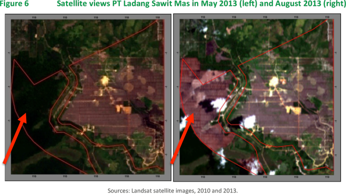 Bumitama Agri is a member of the Roundtable on Sustainable Palm Oil (RSPO), which has adopted a Remediation and Compensation Procedure to allow companies that had previously cleared land without conducting High Conservation Value (HCV) assessments to qualify for certification through remediation and compensation. Chain Reaction Research has not assessed Bumitama Agri’s compensation obligations in detail but assuming recorded deforestation over the 2010-2013 period29 as an indicator, Bumitama Agri would have to provide compensation to the RSPO for an area of approximately 20,000 ha. A recent example is the HCV area deforested recently by Bumitama Agri’s subsidiary PT Ladang Sawit Mas, as shown on the left side of the satellite views of the concession area (Figure 6).