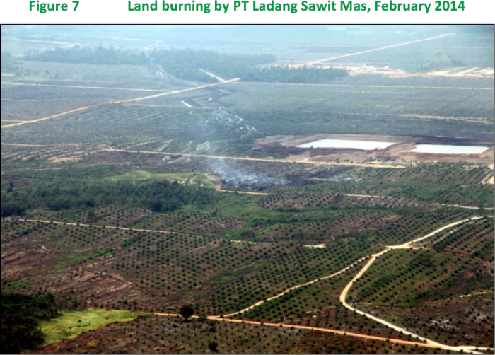 Figure 7 shows a patch of land burning at close proximity of the estate office of Bumitama Agri’s subsidiary Ladang Sawit Mas in February 2014. The fire burned at close vicinity of an excavator presumed to be digging the land or Palm Oil Mill Effluent (POME) basins. This fire was just one of several burnt locations in this concession area, one of which was located even very close to the estate office complex. In its response to the CRR draft-report Bumitama has confirmed the fire in Figure 7 as a sporadic incident. According to Bumitama the fire occurred in an area of not more than 10 ha, and it was effectively extinguished in less than half a day. The company also stated it is a common practice for its plantation to have a watchtower and fire alert procedure, though it also stated to be in the midst of constructing a fire watchtower for PT LSM whilst land clearing already commenced some two years ago. The company also stated that it regularly conducts fire-fighting training with the inclusion of communities in all of its operations. The latest fire-fighting and awareness training was conducted in July 2014 in the PT ASMR and PT NKU area.