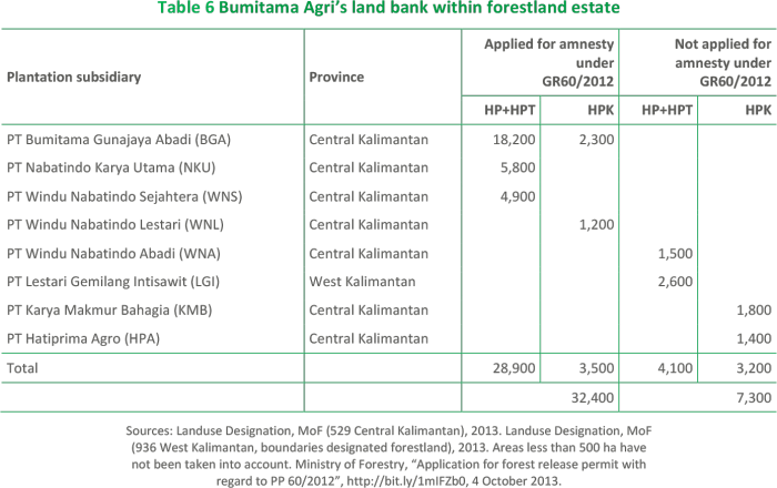 Based on the most recent Ministry of Forestry’s Land use Designation maps for West and Central Kalimantan, the concession areas of eight Bumitama Agri subsidiaries overlap with a total of 39,700 ha of forestland estate. However, according to CRR’s records, Bumitama submitted only four applications for amnesty under Government Regulation 60, covering some 32,400 ha of forestland estate (see Table 6).38 Bumitama, in its response to the CRR draft-report, did not go into details on the area of 32,400 ha.