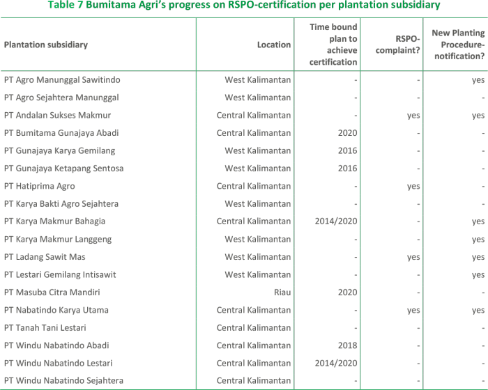 At present, the compensation requirements of the RSPO are separate from the compensation requirements Bumitama may face under Government Regulation 60/2012 (section 2.4.1). For more information on Bumitama and RSPO certification, please see section 2.7.