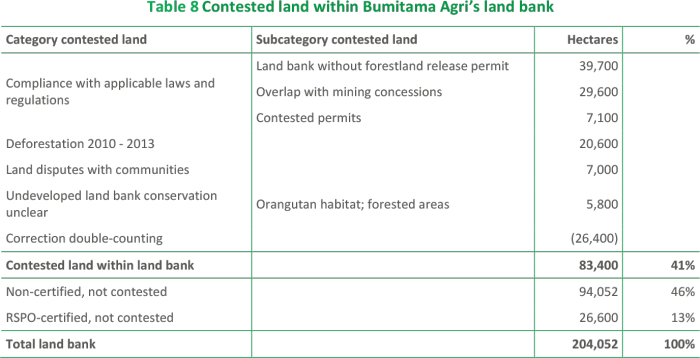 41 percent of Bumitama’s 204,000 hectare land bank – 83,000 hectares of land – is potentially or de facto contested. Though that amount has fallen over the past six months, it is still on the medium-high range for palm oil companies.