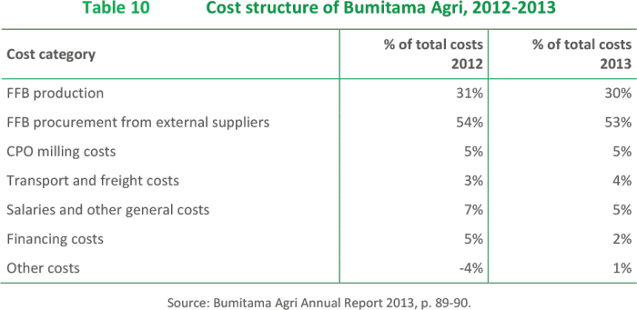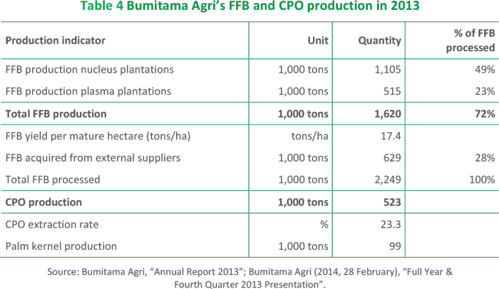 Bumitama Agri operates eight CPO mills with a total FFB processing capacity of 3.1 million metric tonnes per annum, located in close proximity to its plantations.5 In 2014, a new CPO mill will become operational to expand its FFB processing capacity to 4.0 million tons per year.6 Table 4 shows that the volume of FFB processed in 2013 (2.2 million tonnes in 2013) is well below the (future) capacity of its CPO mills.