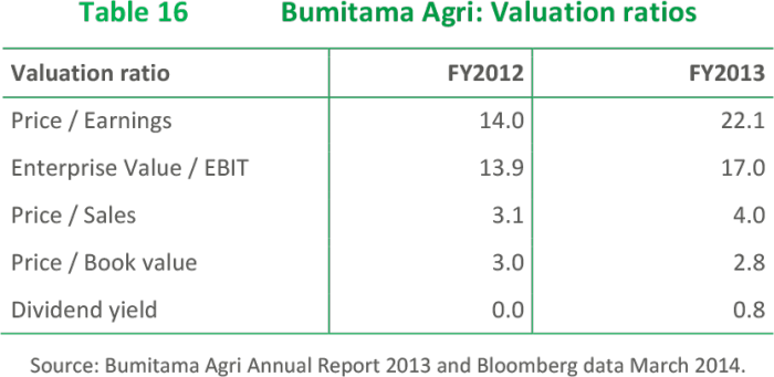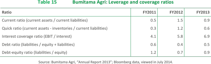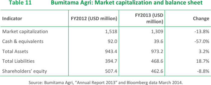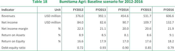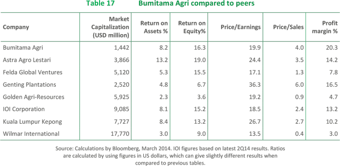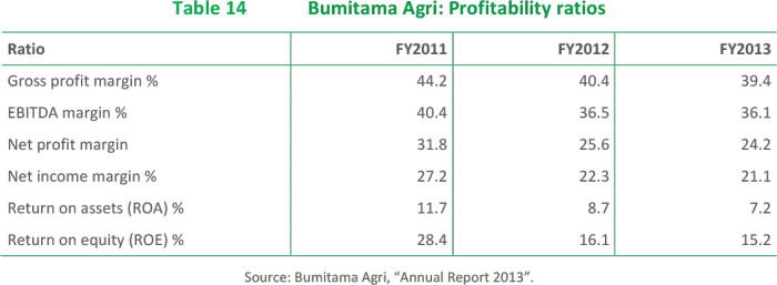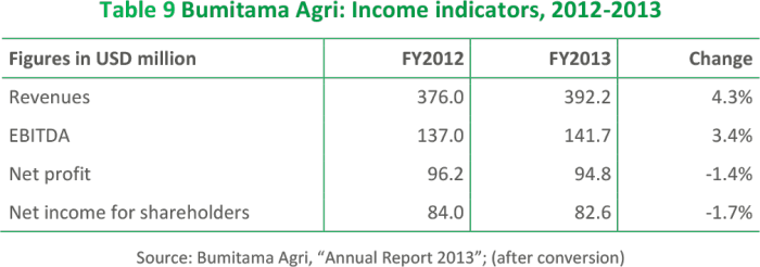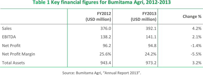 With revenues of USD 392.2 million and a net income of USD 82.6 million in 2013, Bumitama showed a high net profit margin of 24.2% and a Return on Equity (RoE) of 15.2%.
