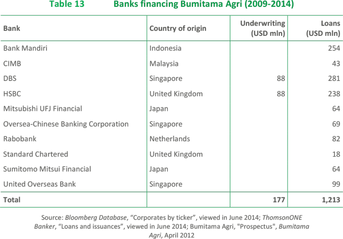 - Bumitama Agri Ltd. “Annual Report 2013.” 2014. Available at: http://ir.bumitama-agri.com/annuals.cfm; Bumitama Agri Ltd. “Full Year & Fourth Quarter 2013 Presentation.” 28 February 2014. Available at: http://bit.ly/1oFqOzY.