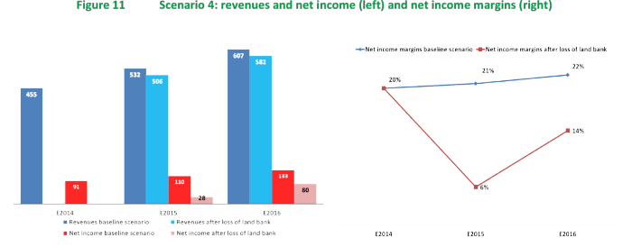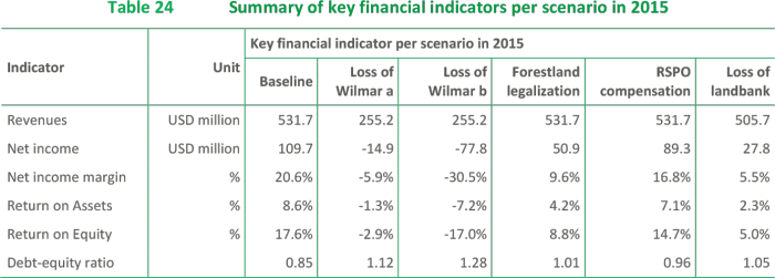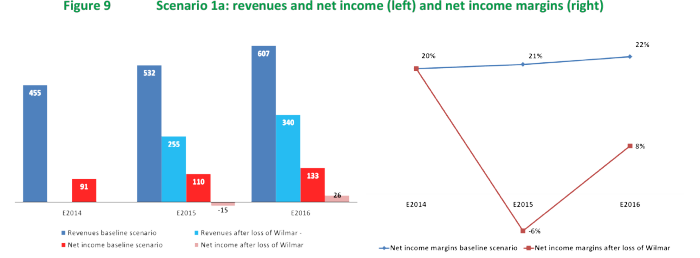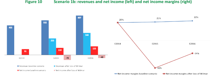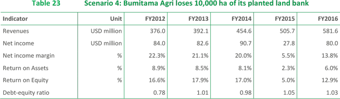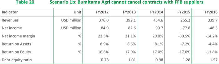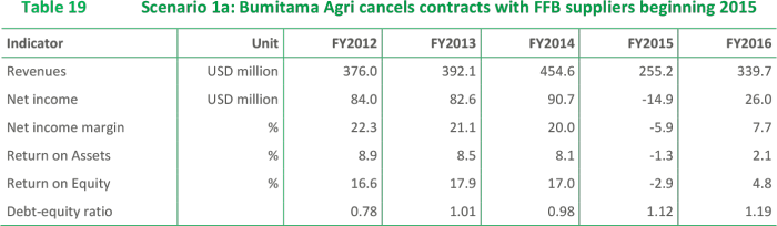 If Bumitama’s senior management does not settle historical wrongdoings and uncontrolled development is left unaddressed, then the group would be exposed to the serious risk of seeing its two main buyers suspend or cancel supply contracts. If its most important customer, Wilmar International, were to stop purchasing Bumitama’s palm oil, the company’s revenue would decline an estimated 43% in 2015 before recovering somewhat in 2016 if the company could find new customers. Under this scenario, Bumitama would experience a negative Return on Equity (RoE) in 2015. Depending on its ability to cut its existing contracts with external FFB suppliers, the company could regain some profitability in 2016. However, should Wilmar’s decision to cancel its contracts be followed by its second largest buyer, Golden Agri-Resources, then the outcome would be disastrous. The two buyers represent about 90% of Bumitama’s market.
