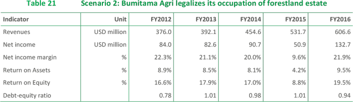 In order to resolve unauthorized forestland occupation of almost 40,000 hectares, Bumitama has sought amnesty for 32,400 hectares. If approved by the Ministry of Forestry, the company will be required to finance forest restoration at an estimated cost of USD 86.7 million. While significant, this cost is likely to be bearable by the company.