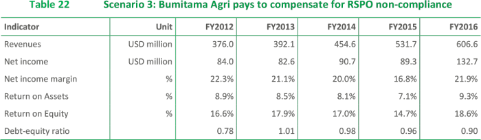 The RSPO Compensation Procedure, which was adopted in April 2014, would require Bumitama to compensate for recent deforestation. CRR did not assess Bumitama’s “compensation debt” in detail. We estimate it may have to settle with RSPO an area of 20,000 hectares for forest cleared for the period 2010-2012 alone. Bearing in mind the forest types cleared, we estimate the compensation at USD 30 million in cash value. Compensation may also be settled in kind in situ or ex situ.