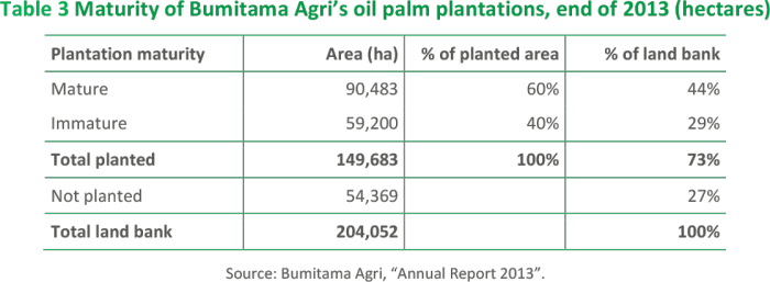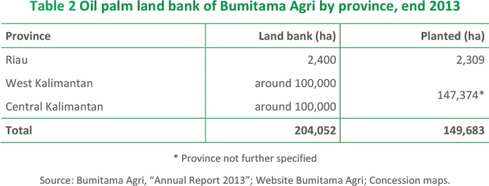 Bumitama reports a total land bank of 204,052 hectares in three Indonesian provinces: West Kalimantan, Central Kalimantan and Riau. At the end of 2013, Bumitama had planted 149,683 hectares with oil palms (see Table 2).11