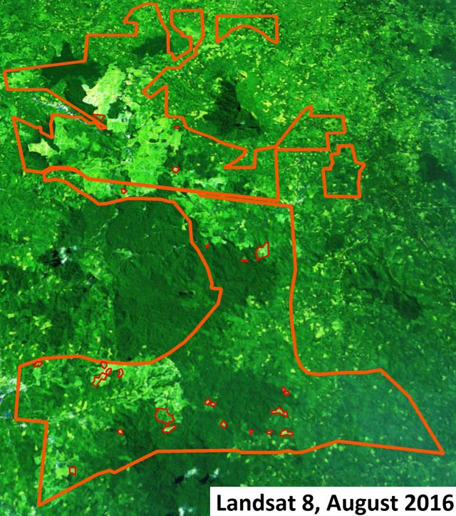 Figure 3: Concession boundaries of DSNG’s plantation companies PT Kencana Alam Permai and PT Prima Sawit Andalan (Sintang district, West Kalimantan). Since June 2015, some small patches (maximum 30 ha) of HCS forests have been cleared (marked in red). Presently, remaining HCS forests inside the concessions comprise 3,700 ha.
