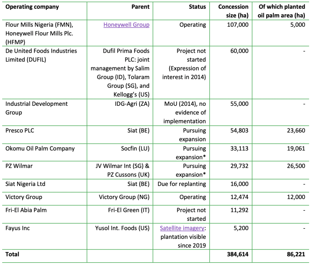 Source: CRR, compiled from several data sources, including Grain et al., 2019, LandMatrix 2021, Orbis 2021, company websites. Note: Grain and Landmatrix data are rather similar, but sometimes numbers differ slightly. For instance, according to Grain et al., Siat holds 54,803 ha concession area in Nigeria, while LandMatrix estimates 54,611 ha. When available, Grain et al. data was selected. *In response to a draft version of this report, Wilmar indicated that the “pursuing expansion” statement was unverified, and Socfin showed data between 2018-2020 showing no change in area planted since 2019. Unclear is what will happen after 2020.