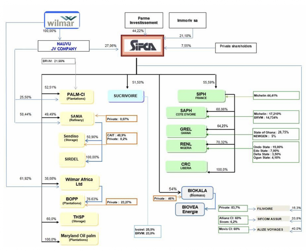 Wilmar, in response to a draft version of this report, asserted that it “does not represent the SIFCA Group” and that “based on the shareholding structure of SIFCA, the attribution of SIFCA’s plantation areas and operations in the draft report in numerous sections to Wilmar is factually inaccurate and misleading.”