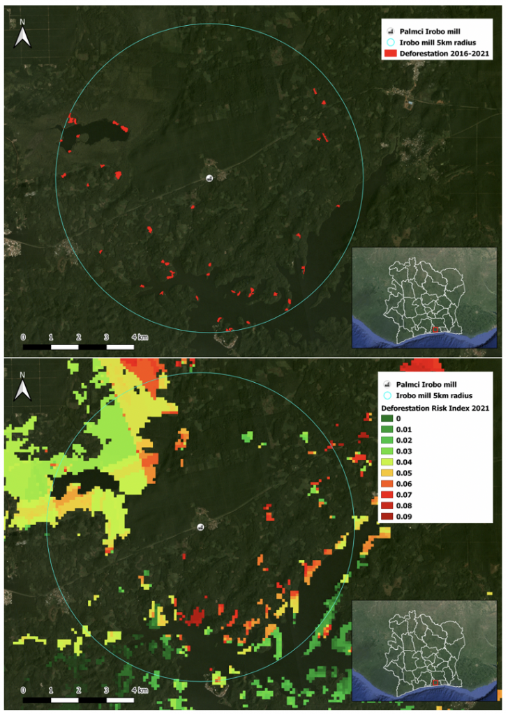 Figure 5: Deforestation of 42 ha in a five km radius around the Palmci Irobo mill (top image), deforestation high-risk areas around the mill (bottom image)