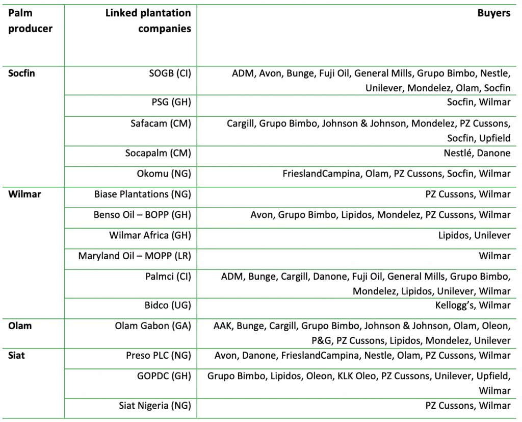 Source: Most recent public palm mill suppliers lists of each company. Notes: The list may not be exhaustive. Socfin has no publicly available palm oil mill lists of its suppliers. Other operating plantation companies of Socfin (e.g., Agripalma, Brabanta, and SAC) could not be linked to any buyers. No links could be found to Straight KKM/Feronia or its operating company PHC.
