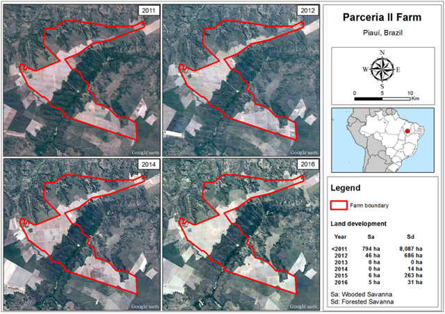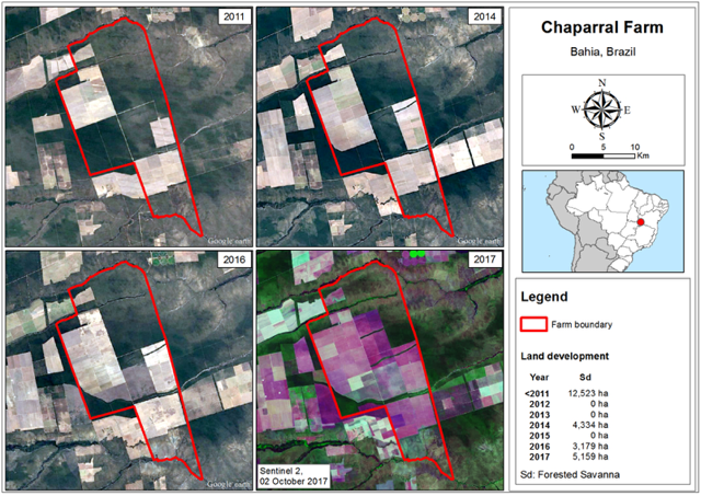 Fazenda Chaparral is in Correntina (Bahia) and was purchased November 30, 2007. The farm is used to produce soy, corn, and pasture. As of 2017, the total farm area was 37,182 ha. Between 2014 and 2017, the appraised valuation of the farm increased by 28 percent to BRL 352 million. 40 percent of the farm is developed, while another 40 percent of the farm still is under development. Between 2012 and 2017, BrasilAgro cleared 12,672 ha of its original vegetation on Fazenda Chaparral. Satellite images from October 2017 indicate that vegetation clearing took place throughout 2017 as well.