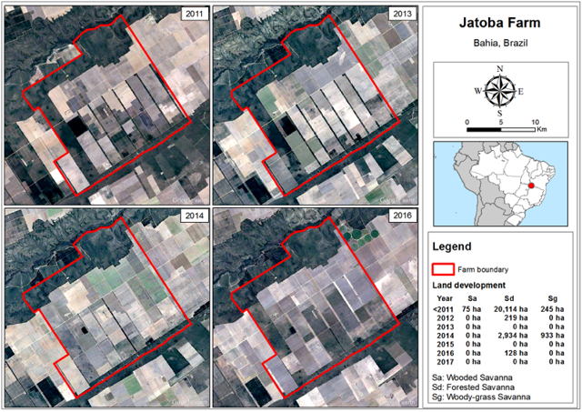 Between 2012 and 2017, BrasilAgro cleared 4,213 ha of its original vegetation on Fazenda Jatoba. Vegetation maps produced as part of Brazil’s Forest Reference Emissions Level (FREL) in the Cerrado Biome categorize the cleared vegetation as Forested Savanna and Woody-Grass Savanna, a grassland formation. 78 percent of the development since 2012 has taken place on forested land, according to Chain Reaction Research analysis. The RTRS identified the cleared lands as areas with ‘stakeholders agree there should be no conversion of native vegetation to responsible soy production‘.