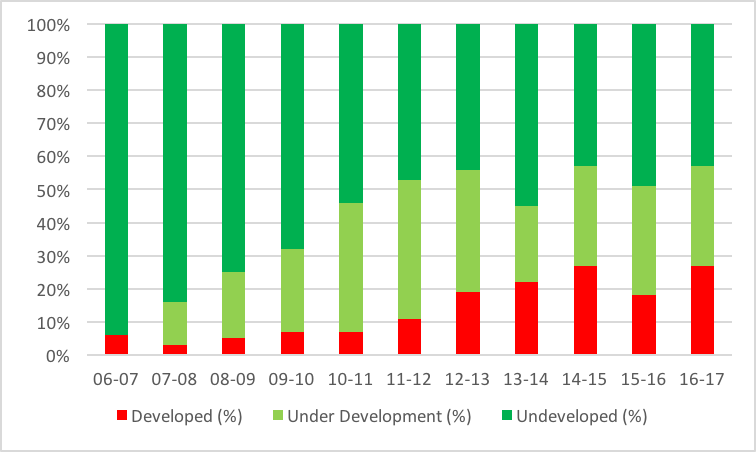 At the time of acquisition, some farms were already partially developed, but farms also contained large strands of undeveloped Cerrado forests. Since 2011, BrasilAgro has transformed 59,600 ha of undeveloped land and pasture into cropland. The transformation includes clearing of native Cerrado vegetation. BrasilAgro states that currently, 30 percent (38,859 ha) of its portfolio is under development (see Figure 5). As of 2017, 43 percent of the portfolio remained undeveloped, consisting of land with native vegetation and unproductive land.