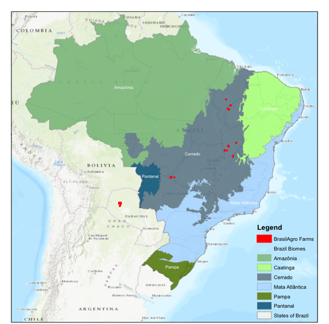 As of Q4 2017, BrasilAgro owns 225,832 ha in its portfolio spread over 11 properties. Ten of its properties are in the Brazilian states of Maranhão, Piauí, Bahia, Minas Gerais, Goiás, and Mato Grosso. One farm is in Paraguay. As shown in Figure 2 (below), BrasilAgro’s farms in Brazil are in the Cerrado Biome, which is one out of six Brazilian continental regions with unique biological diversity.