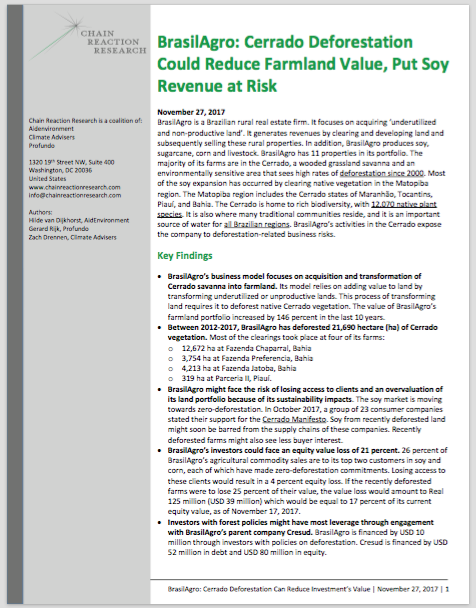 - BrasilAgro might face the risk of losing access to clients and an overvaluation of its land portfolio because of its sustainability impacts. The soy market is moving towards zero-deforestation. In October 2017, a group of 23 consumer companies stated their support for the Cerrado Manifesto. Soy from recently deforested land might soon be barred from the supply chains of these companies. Recently deforested farms might also see less buyer interest.