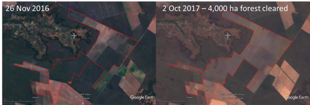 Large parts of the Cerrado have already been transformed, and Piauí saw high rates of deforestation on soy farms between 2010 and 2013. Deforestation is an ongoing process that continued through 2017, with at least 15,000 ha of land cleared for soy expansion (see example in Figure 4).