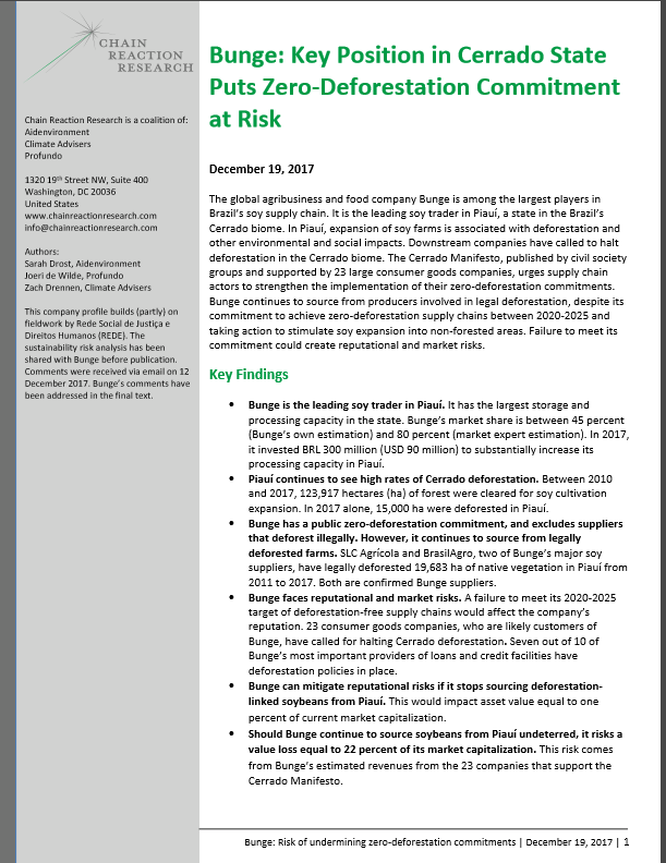 The global agribusiness and food company Bunge is among the largest players in Brazil’s soy supply chain. It is the leading soy trader in Piauí, a state in the Brazil’s Cerrado biome. In Piauí, expansion of soy farms is associated with deforestation and other environmental and social impacts. Downstream companies have called to halt deforestation in the Cerrado biome. The Cerrado Manifesto, published by civil society groups and supported by 23 large consumer goods companies, urges supply chain actors to strengthen the implementation of their zero-deforestation commitments.