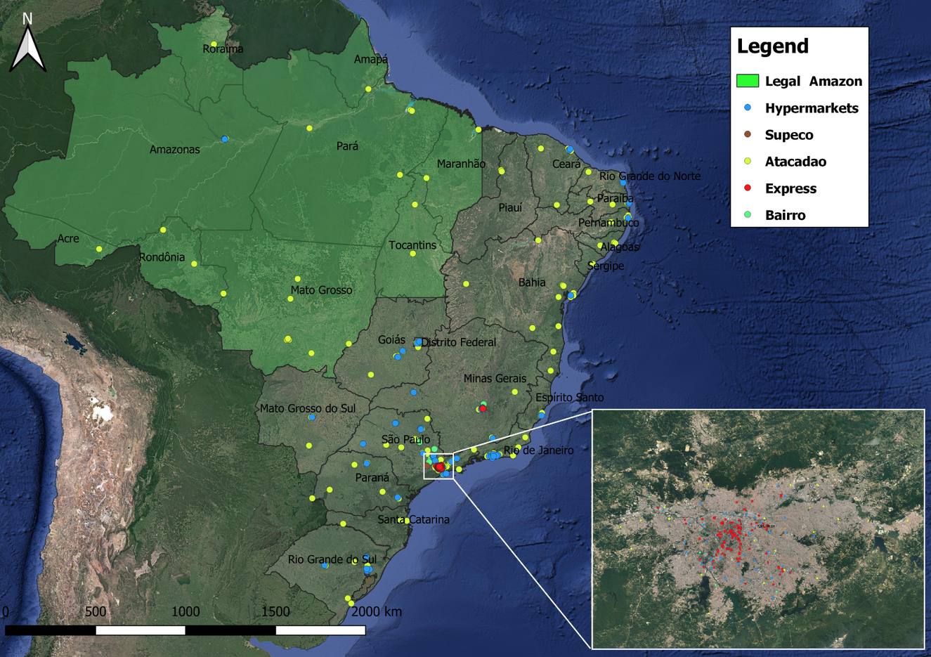Carrefour Brasil is the largest retailer in Brazil, holding a 14 percent market share in 2017. In 2018, gross sales (including VAT) were USD 15.4 billion. Carrefour Group opened its first hypermarket in Brazil in 1975. End 2018, Carrefour Brasil had 435 stores in all 27 Federal Units of Brazil (Figure 2). In total, it runs 100 hypermarkets (Carrefour Hypermarket), 49 supermarkets (Carrefour Bairro), 120 convenience stores (Carrefour Express), and 166 wholesale stores (Atacadão).