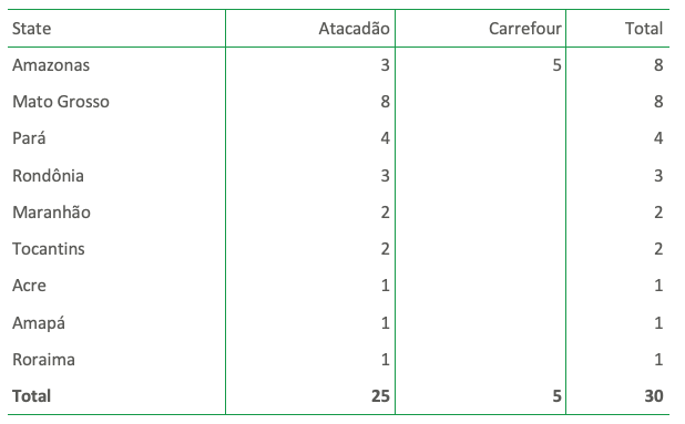 Carrefour Brasil has 30 supermarket operations in nine Amazon states (Figure 3). Carrefour’s presence in the Amazon allows the company to legally source beef from slaughterhouses with SIE and SIF licenses.