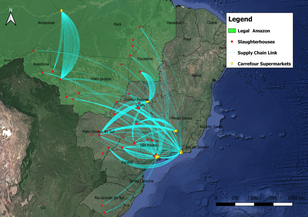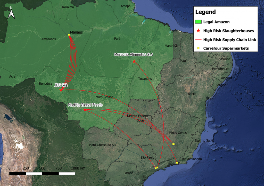 Figure 8 below depicts the locations and supply chain links of these three high-deforestation risk slaughterhouses and Carrefour.