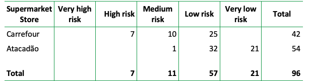 Of the total sample of 480 beef products, 11 products (2.3 percent) originated from high-risk slaughterhouses in the Amazon. Carrefour sourced these products from three meatpacking companies: JBS, Marfrig Global Foods, and Mercúrio. The slaughterhouses are all TAC signatories. Sourcing from slaughterhouses with TACs may still carry large risks because deforestation occurs in their supply sheds.