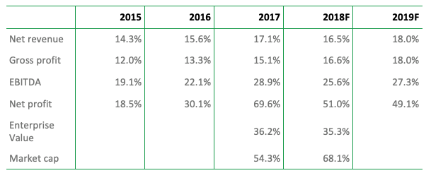 In total net revenues, the Brazilian operations total 17 percent to Carrefour’s 2017 global revenues (Figure 9). In EBITDA and net profit (before minority deductions), the percentage of contributions from Brazil were even higher at, respectively, 29 percent and 70 percent. In 2018 the net profit contribution is estimated at 51 percent. These calculations abstract from third party contributions.