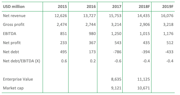 The global entity Carrefour SA carries a high amount of gross debt, mainly in bonds. Carrefour Brasil has a net cash position in 2017-18, which amounts to USD 394 million at the end of 2018F (Figure 10). By contrast, Carrefour SA/France has a net debt position of USD 4.2 billion in 2018F, and Bloomberg consensus estimates point to USD 3.4 billion by the end of 2019F.