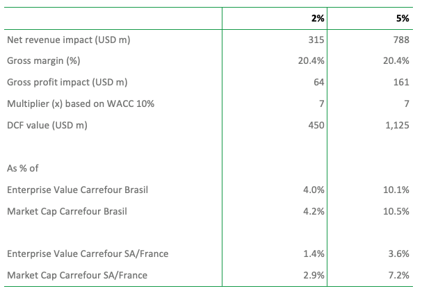 Source: Chain Reaction Research. Last two lines in the table: Impact on EV and Market Cap of global Carrefour.