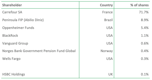 Carrefour SA holds a majority share in Atacadão SA/Grupo Carrefour Brasil (Carrefour Brasil, CRFB3), the entity that operates the various Carrefour formats in Brazil. Figure 1 shows the ownership structure of Carrefour Brasil.