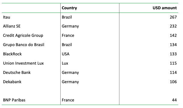 - Deutsche Bank (USD 114 million bonds in Carrefour) says it is committed to stop deforestation. It has signed the New York Declaration on Forests and the Soft Commodities Compact.