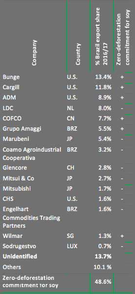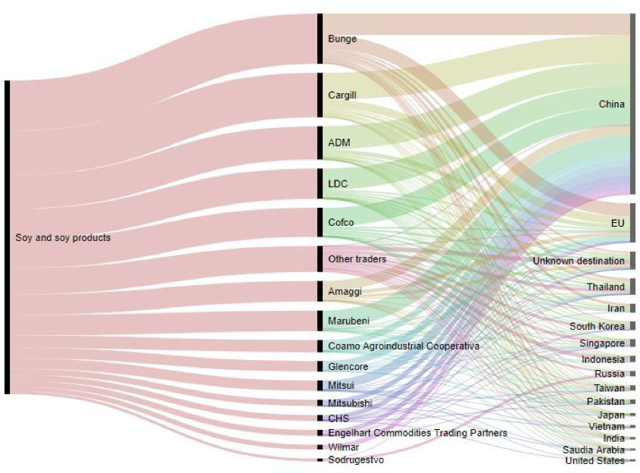 Figure 4: Key exporters and export destinations of Brazilian soy, market year 2016/17. Source: Panjiva.