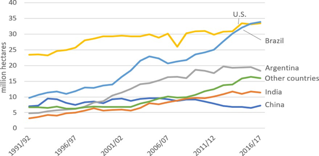 Figure 2: Global soy cultivation area (million ha). Source: USDA.