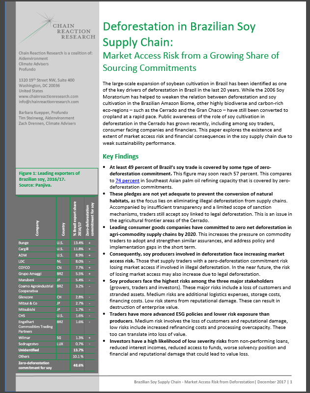 The large-scale expansion of soybean cultivation in Brazil has been identified as one of the key drivers of deforestation in Brazil in the last 20 years. While the 2006 Soy Moratorium has helped to weaken the relation between deforestation and soy cultivation in the Brazilian Amazon Biome, other highly biodiverse and carbon-rich eco-regions – such as the Cerrado and the Gran Chaco – have still been converted to cropland at a rapid pace. Public awareness of the role of soy cultivation in deforestation in the Cerrado has grown recently, including among soy traders, consumer facing companies and financiers. This paper explores the existence and extent of market access risk and financial consequences in the soy supply chain due to weak sustainability performance.