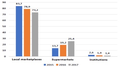 In 2017, some 73 percent of Colombian consumers bought beef at local marketplaces such as market squares and neighborhood stores, whereas supermarkets accounted for only 25 percent of the sales locations. Institutions such as prisons and community kitchens accounted for 1 percent of total beef sales locations. Figure 15 shows that supermarkets are becoming more important sales locations, increasing their market share by 11.7 percent for the period 2015-17. This increase comes mainly at the expense of local marketplaces, which lost 10.5 percent of their market share during the same period.