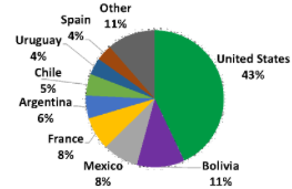 The dairy trade imbalance of Colombia is apparent when looking at the 2017 dairy imports, which amounted to 4.4 billion liters and represented a total value (CIF, Cost Insurance and Freight) of USD 109.3 million. These imports equal 62 percent of the total domestic production of 2017. Compared to 2016, when 58.2 billion liters were imported, the amount of imports have decreased by 25 percent. However, when comparing 2017 imports with the average imports of 0.9 billion liters for 2003-2011, imports in 2017 were still relatively high. Most dairy imports originated from the United States (43 percent), Bolivia (11 percent), Mexico and France (both 8 percent) (Figure 12). Milk powder (58 percent, whole and skimmed), whey (30 percent) and cheese (6 percent, fresh and other) are the top imported dairy products.