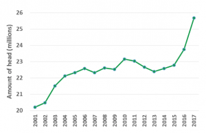 In 2017, the Colombian cattle herd totaled 25.7 million head, which corresponds to 2.6 percent of the global cattle stock. As seen in Figure 5, over the period 2001-2017, the cattle herd has been steadily increasing, reaching its highest level so far in 2017. Since 2015, the herd has rapidly increased, showing a 13 percent expansion in two years.