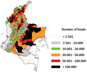 Figure 6 shows the location and density of the cattle herd within the country as of 2016. In 2016, there were 494,402 cattle farms. Most extensive cattle ranching takes place in the natural regions of the Amazon and Orinoquía. The departments of Antioquia, Caqueta, Casanare, Cesar, Cordoba, Meta and Santander accounted for more than 50 percent of the Colombian cattle herd. Caqueta is located in the Amazon.