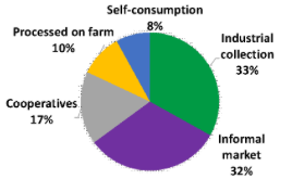 In 2017, the Colombian market for raw milk reported a total revenue of USD 2.1 billion, while the 78 largest dairy companies in Colombia accounted for a total revenue of USD 3.1 billion. In that same year, raw milk production stood at 7.1 billion liters, making Colombia the fourth largest milk producer in Latin America. Figure 10 shows the destination of the produced milk. Most of the milk either ends up at industrial companies (33 percent) or in the informal market (32 percent). Unlike the decreasing trend in cattle slaughtering since 2013, milk production has increased by 7 percent over the 2013-2017 period. Since 1990, when milk production stood at 3.9 billion liters, the production of milk reached an all-time high in 2017. However, the country lacks competitiveness, having high cost of production compared with its competitors. This difference can be explained by the fact that Colombia’s dairy producers rely on concentrate-based animal nutrition products made from imported corn and soy, which is hindering the industry’s growth. A lack of processing efficiency at the end of the dairy chain for products like cheese and milk powder adds to Colombia’s lack of competitiveness.