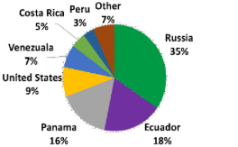 Ninety-two percent of the Colombian milk production was consumed domestically in 2017. In that same year, 556.1 million liters of dairy products were exported. The exports were valued (FOB, Free On Board) at USD 22.0 million and corresponded to 8 percent of that year’s total milk production. Most of the dairy exports went to Russia (35 percent), Ecuador (18 percent) and Panama (16 percent) (Figure 11a). Milk powder, both whole and skimmed, accounted for 73 percent of the total dairy exports, while butter (10 percent) and condensed milk (9 percent) were the most important other dairy export products (Figure 11b).