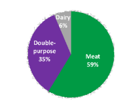 Figure 7 shows what the Colombian cattle herd is used for, as of 2017. On the national level, 58.5 percent of cattle is devoted to meat production, 34.7 percent is dual purpose production and 6.4 percent is specialized dairy. Dairy cattle herds are mainly located on high Andean forests and moors, plateaus and low moorland; double purpose cattle breeds for meat and milk productions are mainly found in tropical areas.
